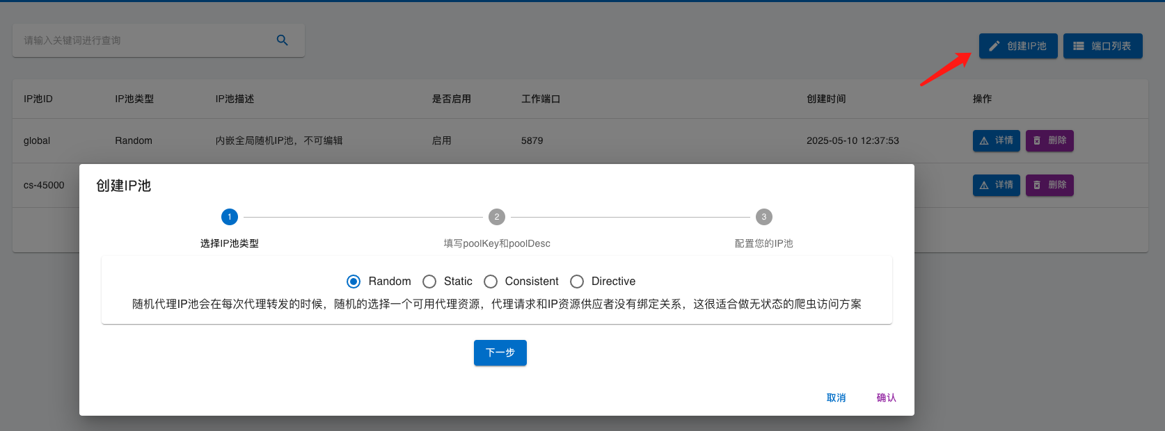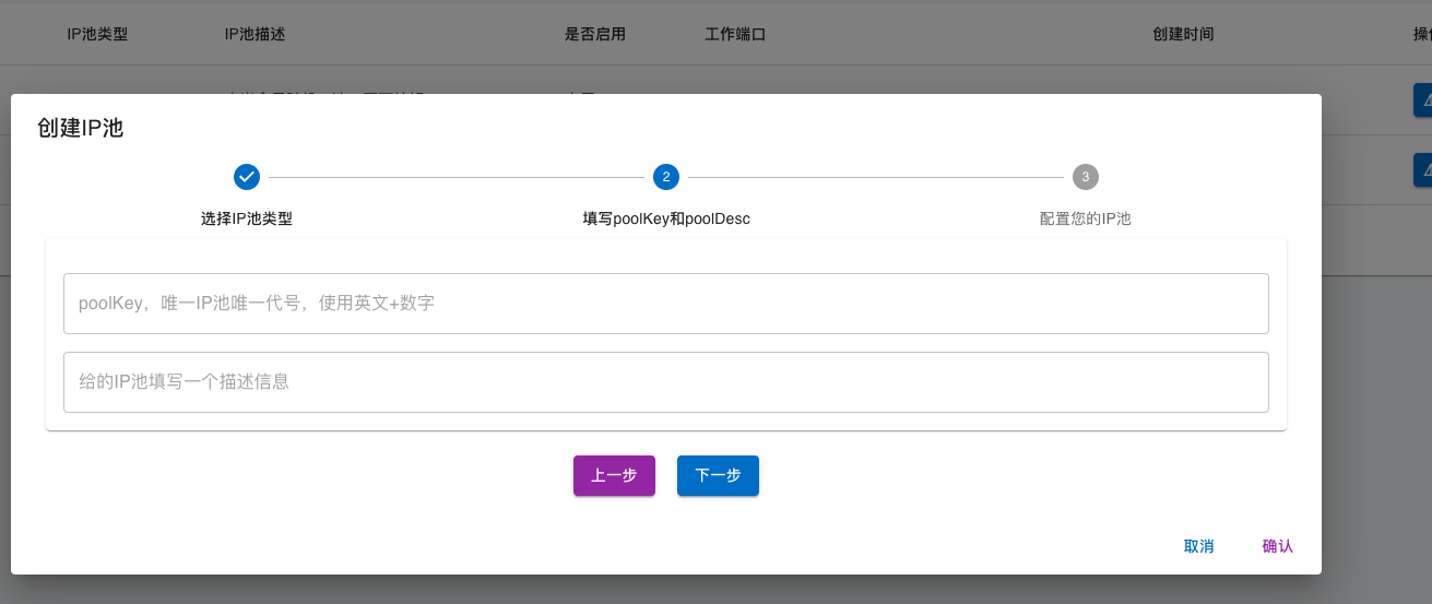 在IP池列表页面,点击《创建IP池》即可进入IP池创建配置向导